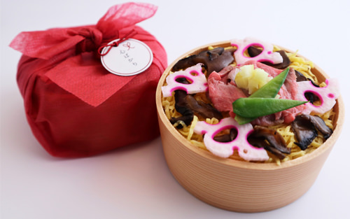 旨みが自慢の松阪牛ローストビーフと自家製たれで炊き上げた国産牛のそぼろに、錦糸玉子や花れんこんなど色とりどりの食材をのせた、食感も楽しい手のひらサイズの肉ちらし寿司。紅色の風呂敷で包んだ愛らしい一品で、”自分買い”はもちろん、ちょっとした差し入れにも最適です。