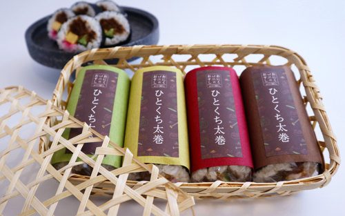 お肉をベースにした、“ちょうどいい”サイズの太巻。国産牛そぼろ、厚焼き玉子、かんぴょう、きゅうり、桜でんぷんを包んだプレーンのほか、おろしぽん酢、辛みそ、ねぎ塩、牛めし、焼肉マヨネーズの6種の味わいをご用意しています。ひとくちサイズにカットされているので、出先でも食べやすく、手土産にもおすすめ。和紙をまとう絵巻物のような上品なパッケージは、別売りの竹かご(352円)に詰め合わせてギフトやおもてなし用にも。