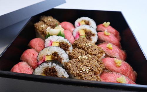 松阪牛ならではの、甘みのある脂を堪能できるローストビーフの握り寿司が10貫も入っているほか、国産牛の押し寿司や太巻もギュッと詰め込んだ、高級感のある華やかな寿司箱。誕生日や記念日はもちろん、様々な”集う場所”に笑顔を届ける盛り合わせです。
